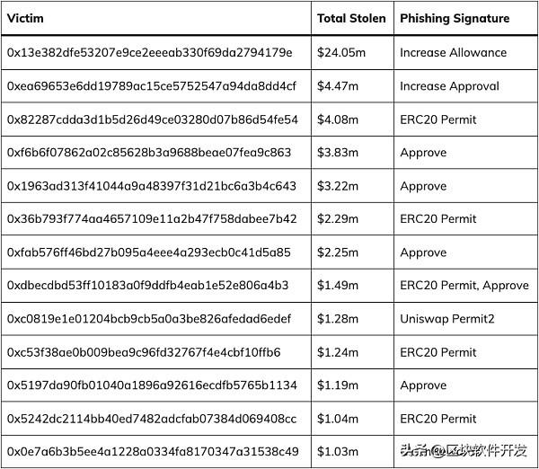 以上是受盗窃影响最严重的受害者,累计损失达5000万美元。可以看出,主要原因是签署Permit、Permit2、Approve、Increase Allowance等钓鱼签名。