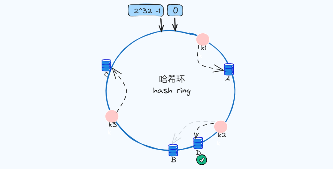 k1、k2、k3经过哈希计算后在哈希环的位置,顺时针方向找到离自己最近的节点,比如k1最近的节点是A,节点A就是存储 k1数据value的节点。