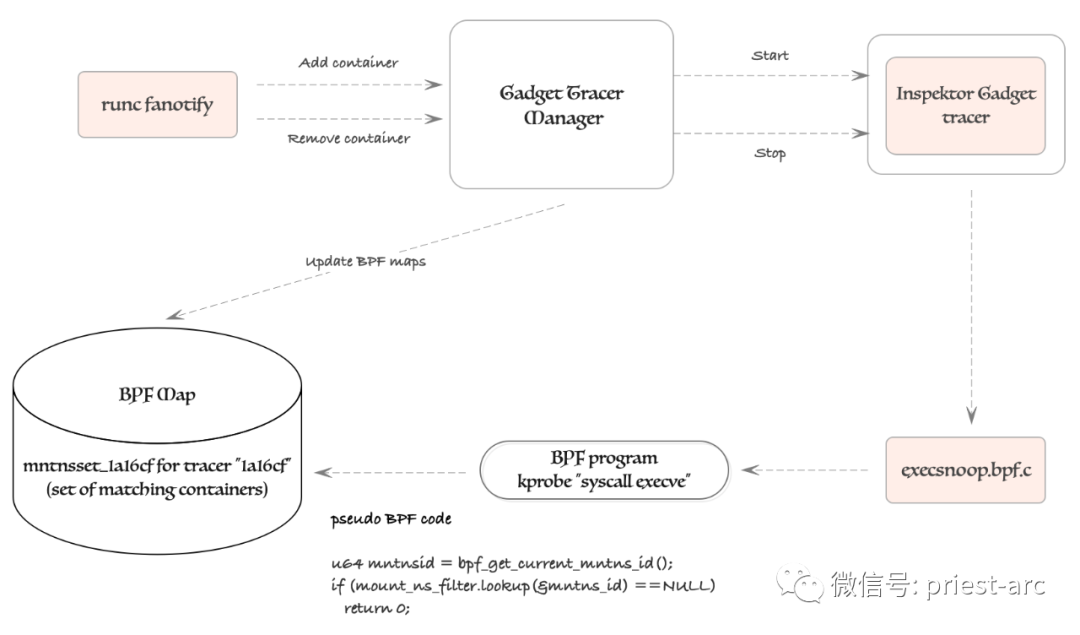 为了了解当前正在运行的容器,Gadget Tracer Manager 利用 runc-fanotify 技术。监视容器运行时的文件系统活动。通过与 runc-fanotify 集成,Gadget Tracer Manager 能够获取有关当前正在运行的容器的信息。