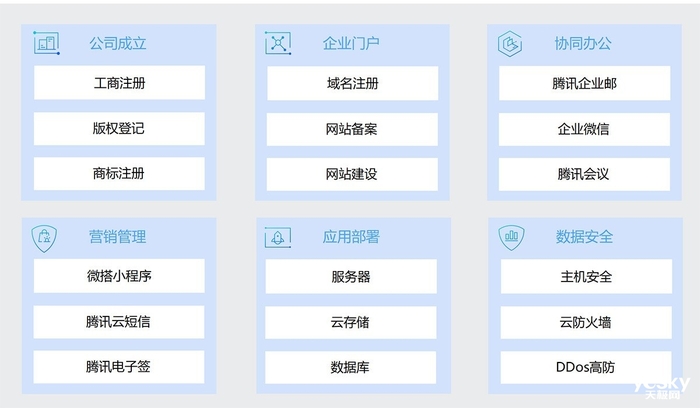 其实不然。目前云计算服务供应商提供的最基本的服务,连IT需求不多的小微企业也能用得上。除了最基本的网站相关服务(如域名注册、建网站、备案这些传统的IaaS服务),云厂商还提供了其它的公司常用服务,如商标智能注册申请、智能LOGO设计、云上公司/个体工商户注册、软件著作权登记申请等这些中小微企业需要的服务。涵盖了公司成立、企业门户、协同办公等,这些都可以在线上简单完成。