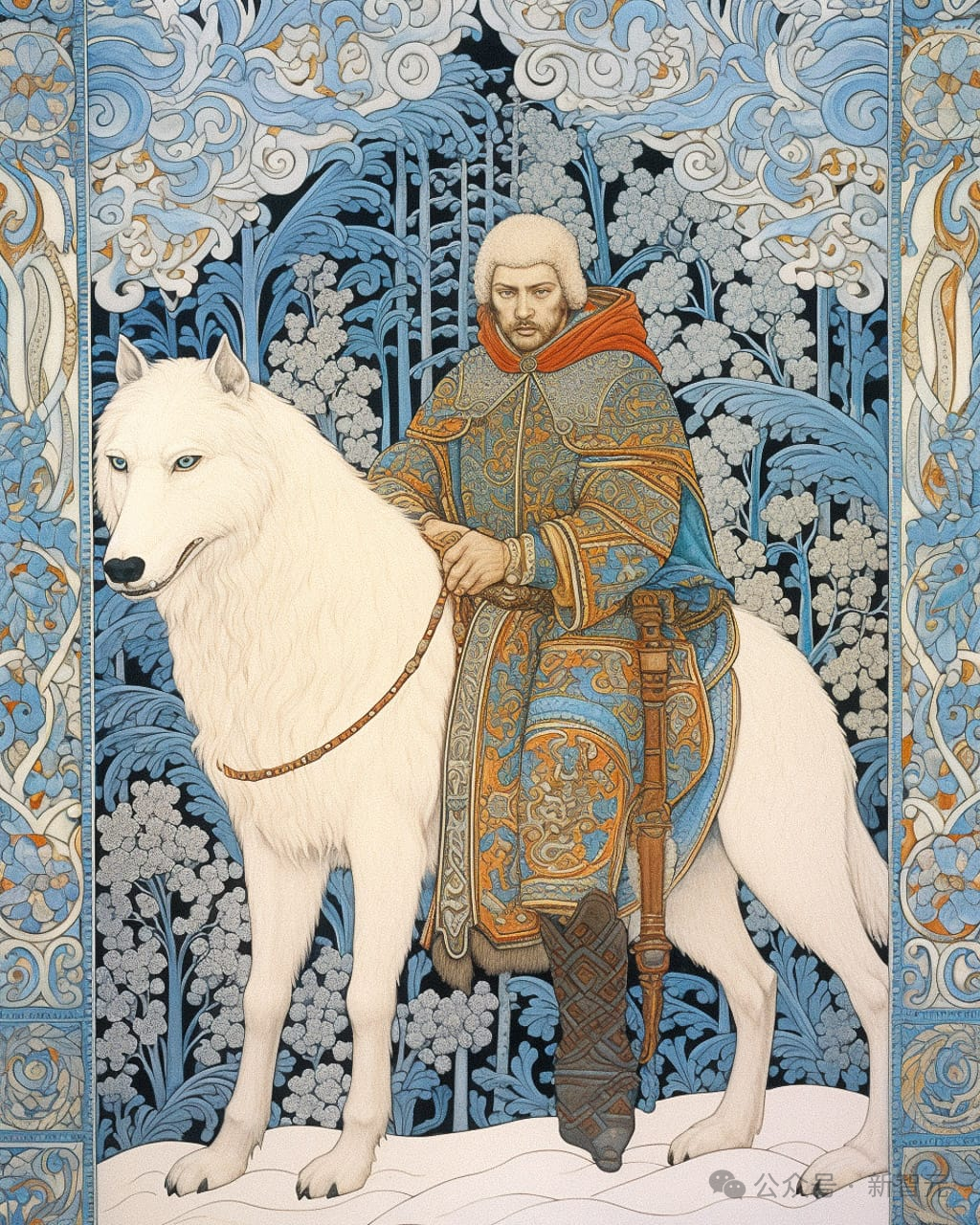 Ivan Bilibin的画作,描绘骑着白狼的冬季领主