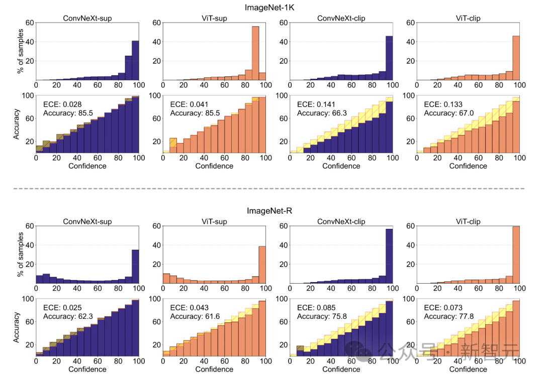 研究人员在ImageNet-1K和ImageNet-R上对校准进行了评估,将预测分为15个等级。在实验中,观察到以下几点: