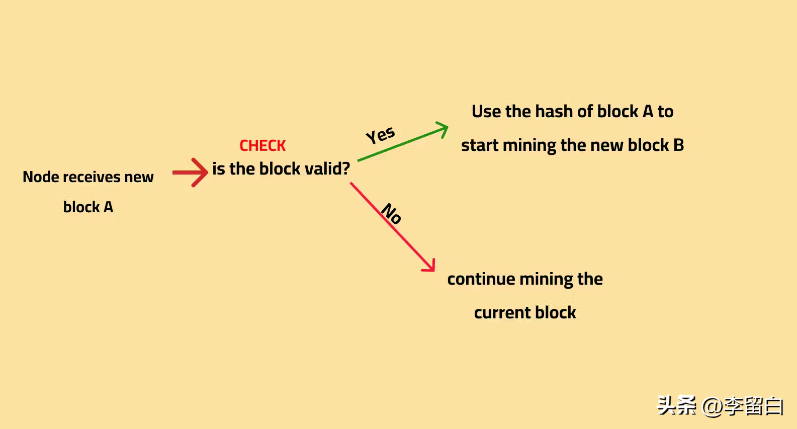 网络上的所有节点总是在竞相寻找下一个要添加到链中的有效块。当一个节点找到一个有效的块时,它会将其广播到整个网络以供其他节点验证。当竞争中的其他节点收到这个有效块时,他们确认它确实有效,停止他们一直在做的事情,并立即开始使用收到的块作为链上的参考来寻找下一个有效块。