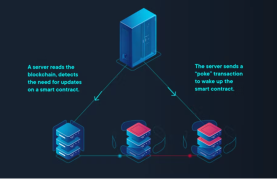 目前,智能合约需要触发才能发挥作用。这意味着,智能合约代码在区块链上处于休眠状态,直到特定事件(例如交易、更新或配置请求等)由区块链用户发起,并导致适当的智能合约唤醒和执行任务(即触发)。这种响应式思想导致区块链由集中式服务器或机器人进行管理(以协调用户请求和智能合约的功能)。这种集中式控制限制了可用区块链,因为它降低了区块链的安全性,并最终破坏了去中心化的目的。