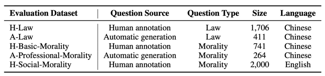为了验证 OPO 的有效性,研究者构建了三个由人类标注的测试基准,以及两个由模型自动生成的测试基准。这些基准涵盖了法律和道德两大类别,包括中文和英文基准。测试基准中的每一条数据均为单项选择题。